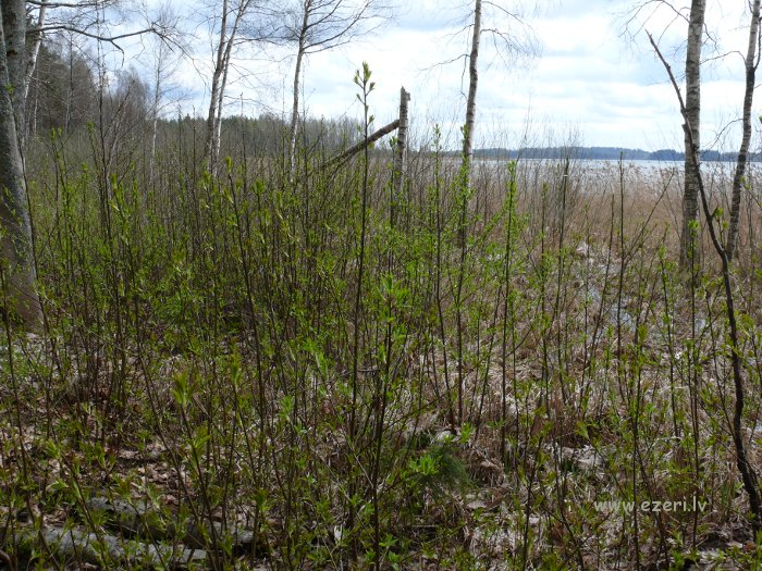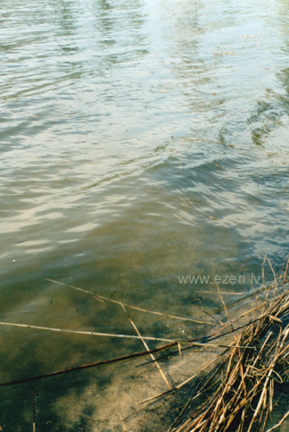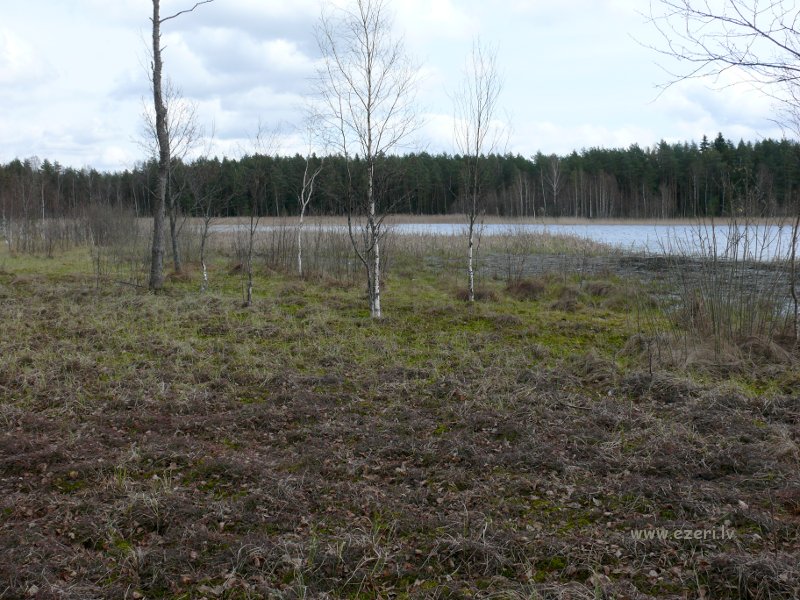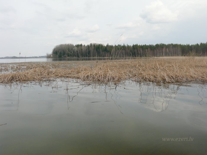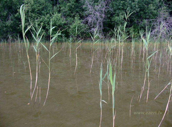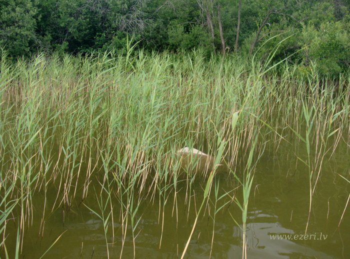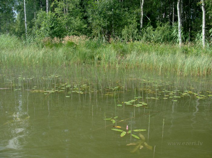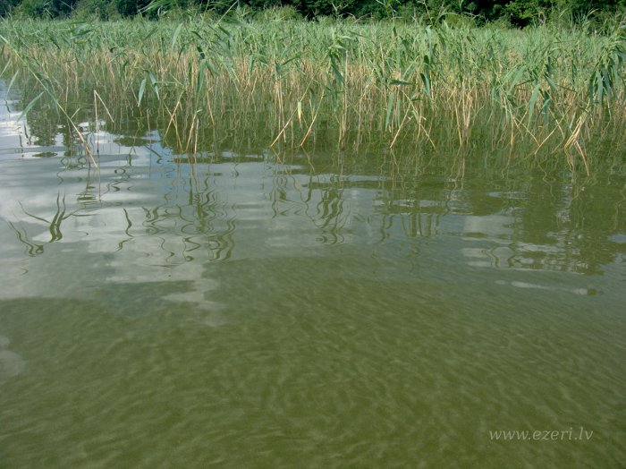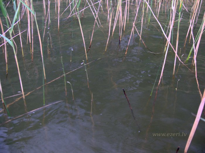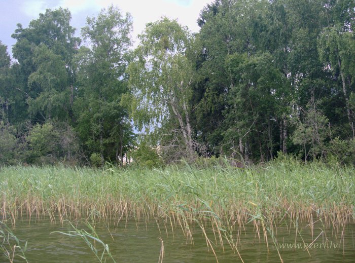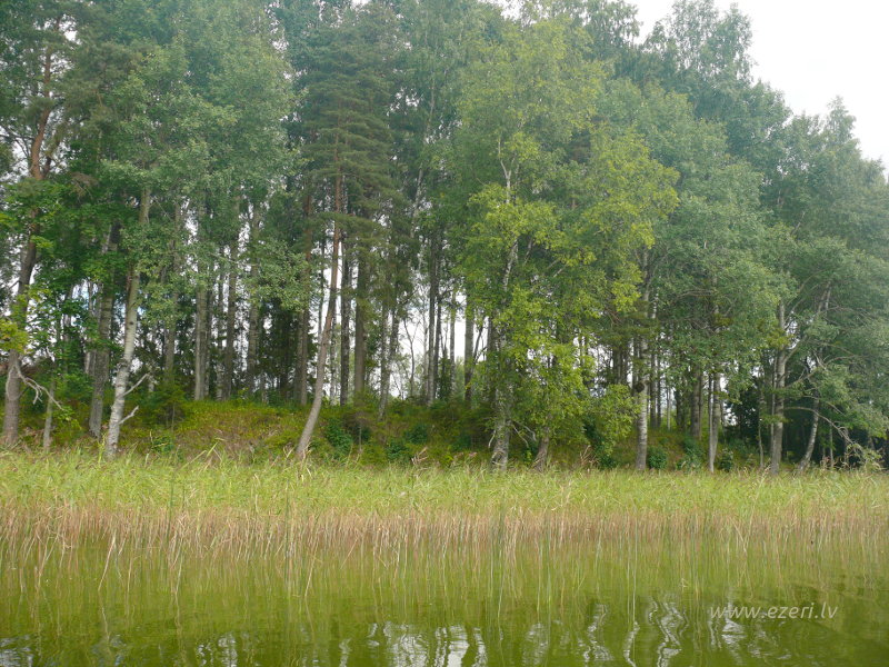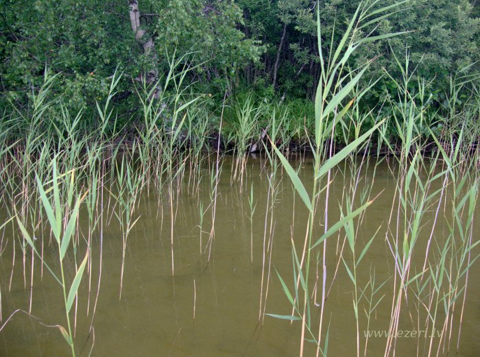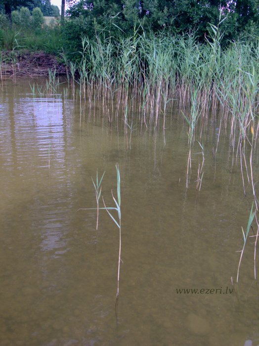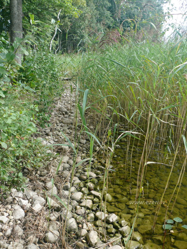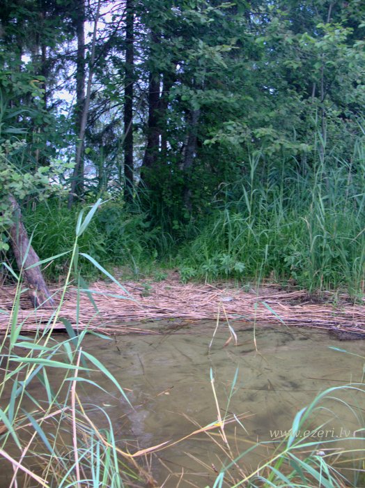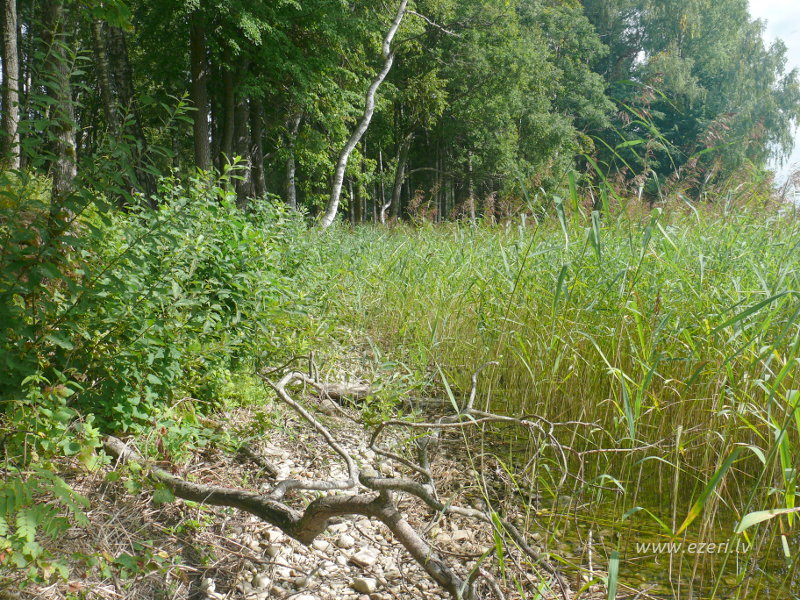 photograph Gar ūdeni zems, krūmiem un niedrēm aizaudzis krasts, pēc 20 m - krasta valnis. |