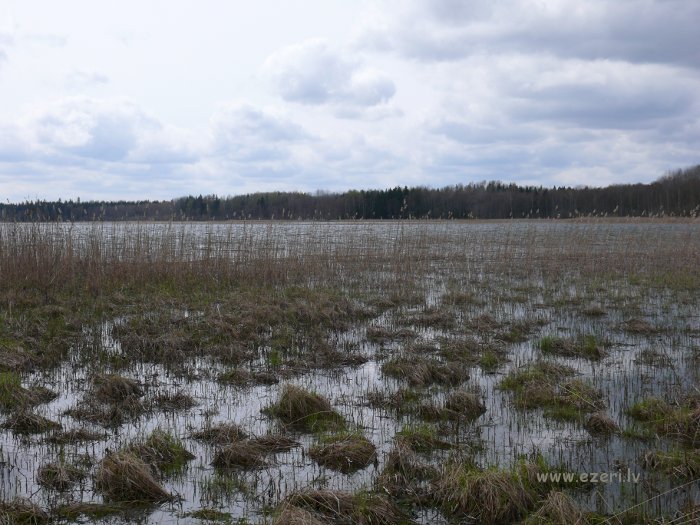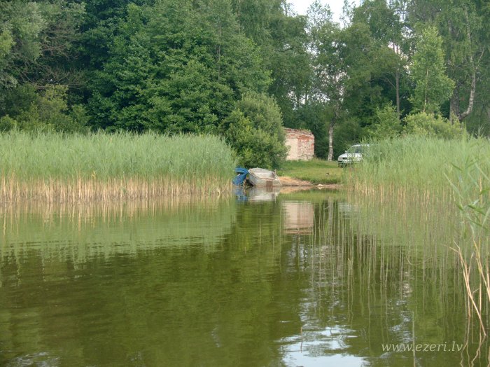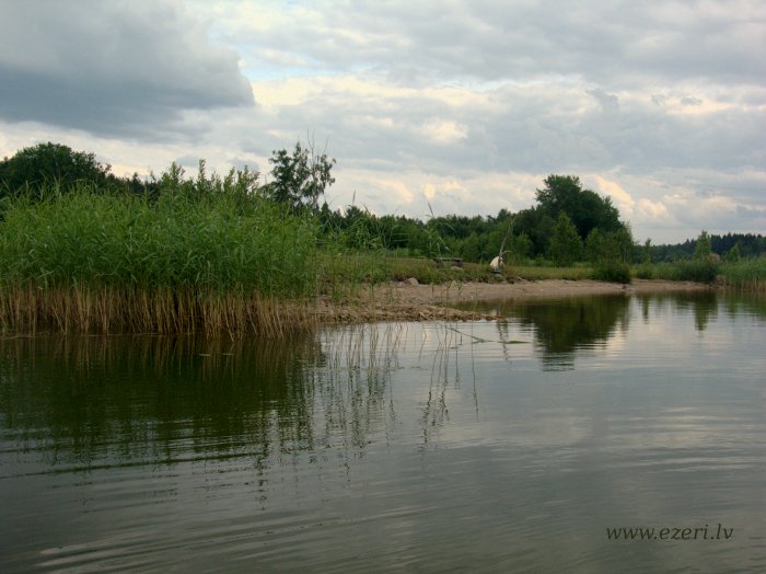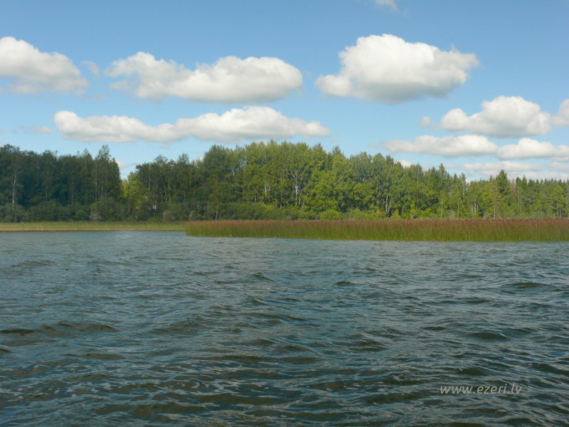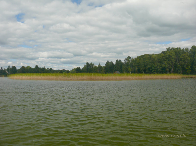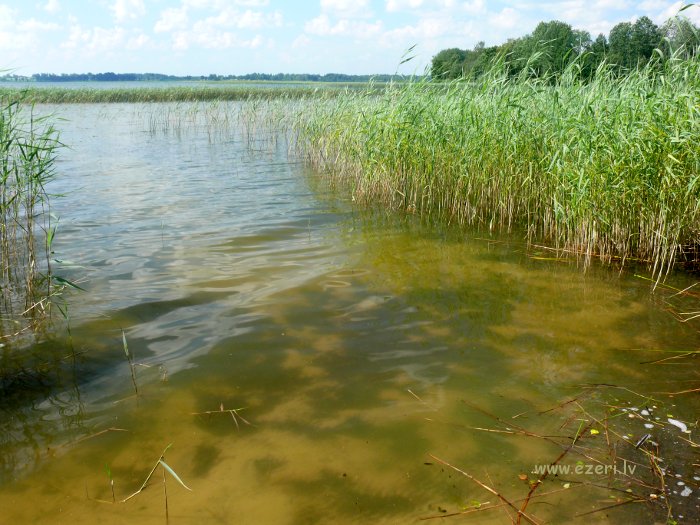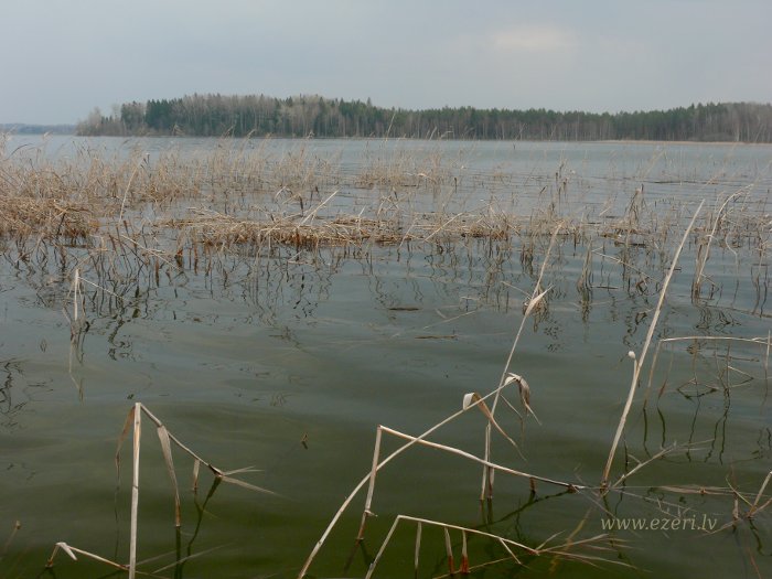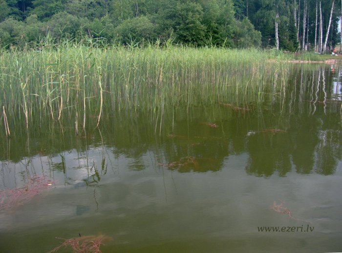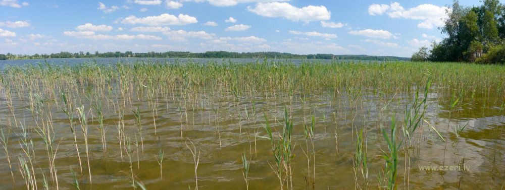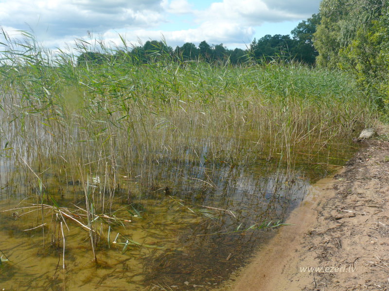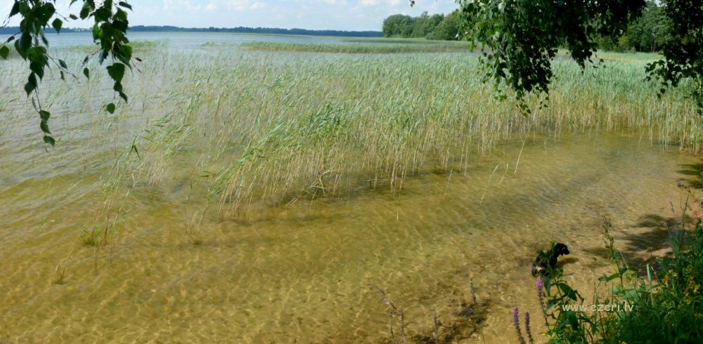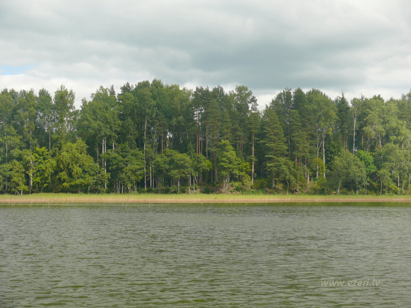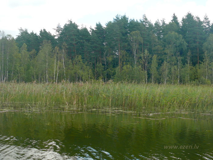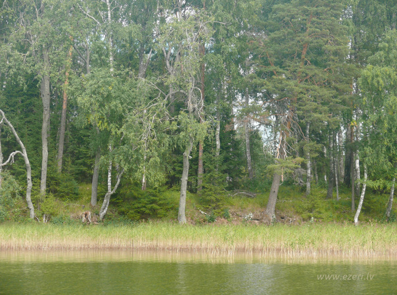 photograph Gar ūdeni zems, krūmiem un niedrēm aizaudzis krasts, pēc 20 m - krasta valnis. |