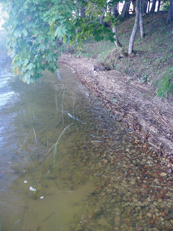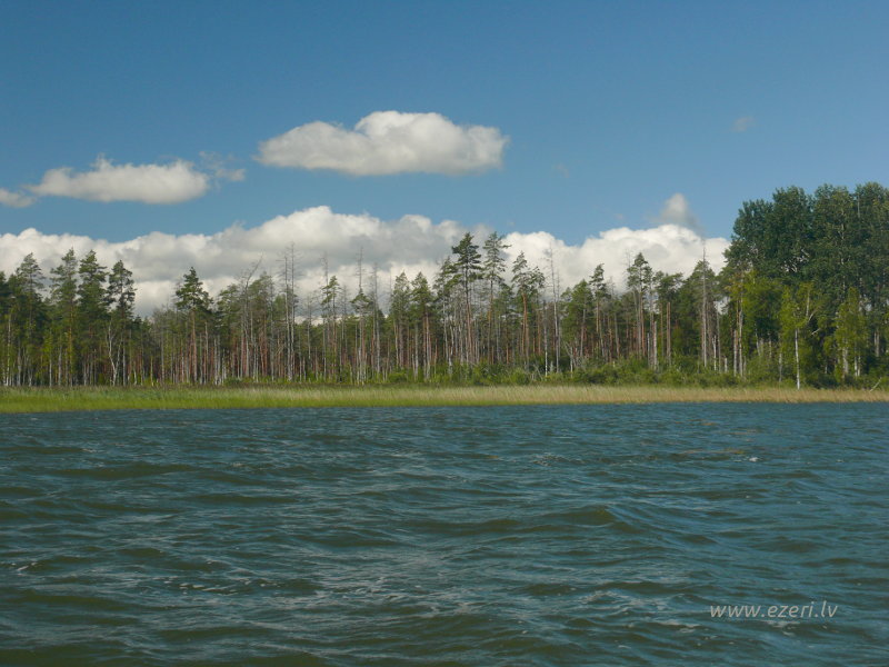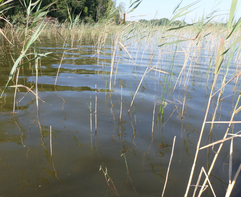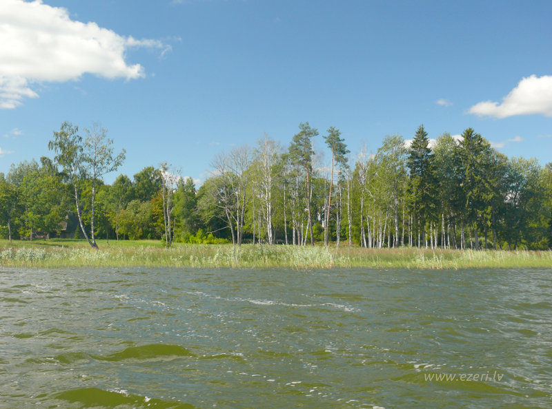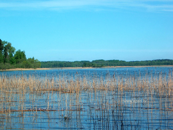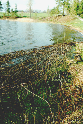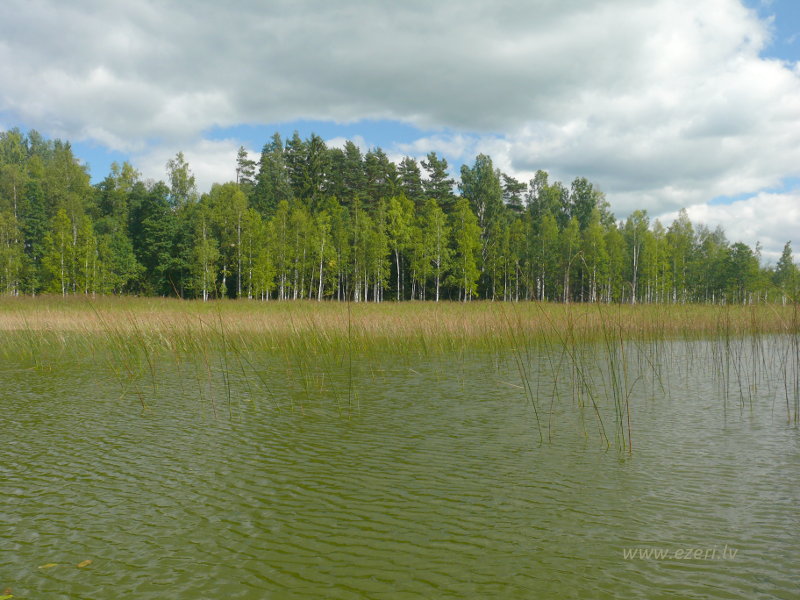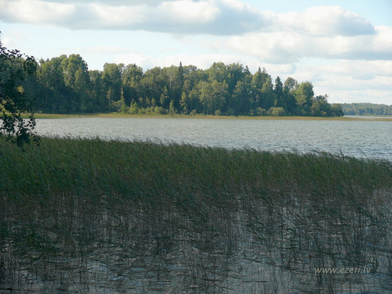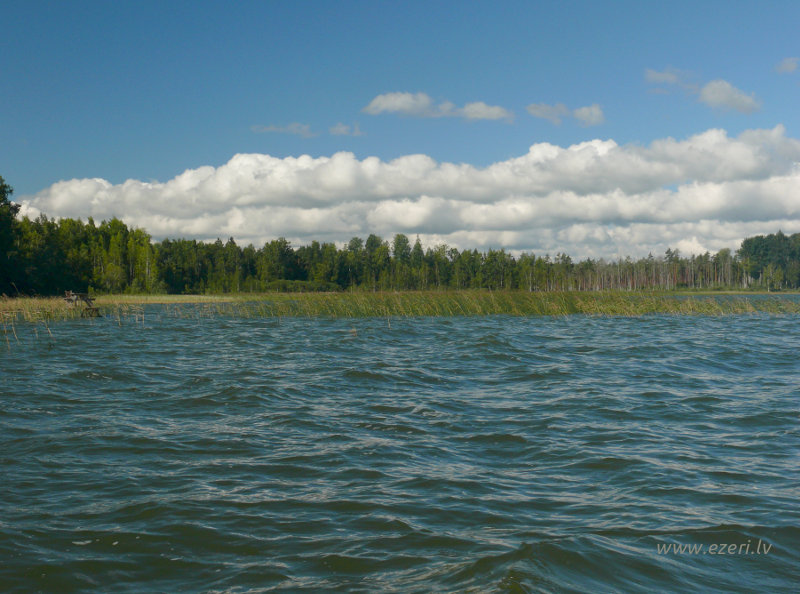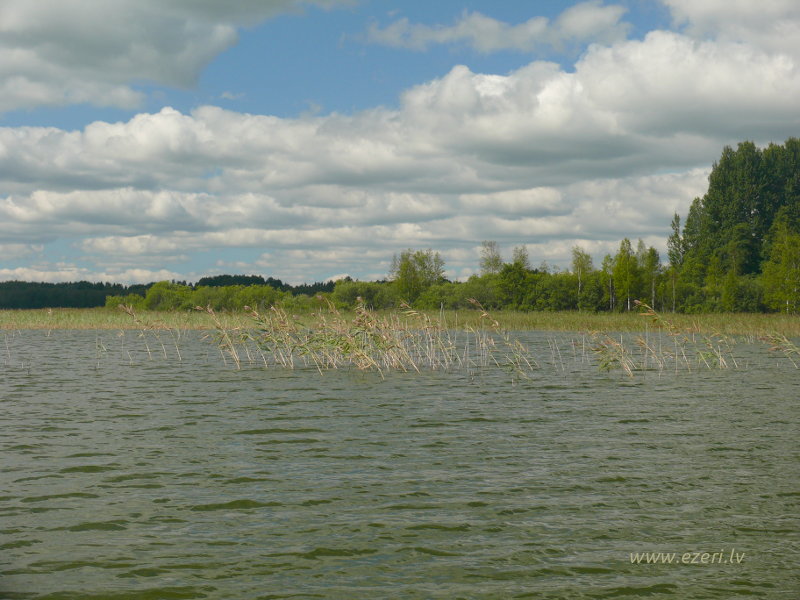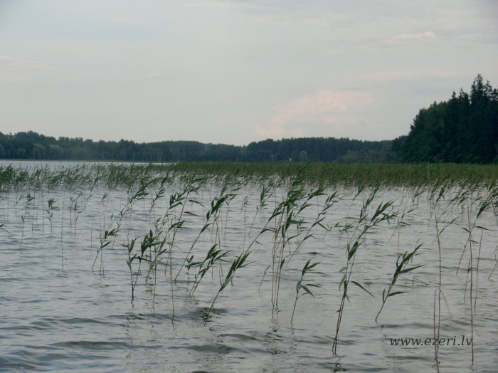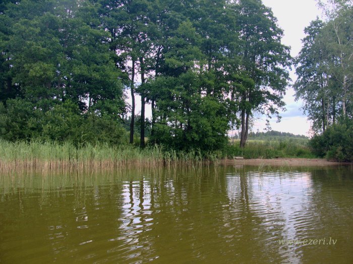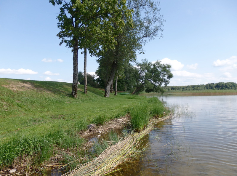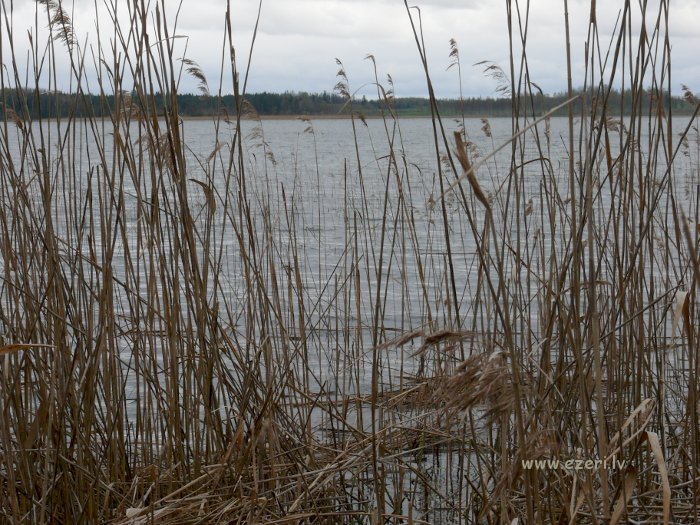 photograph Gar ūdeni zems, krūmiem un niedrēm aizaudzis krasts, pēc 20 m - krasta valnis. |