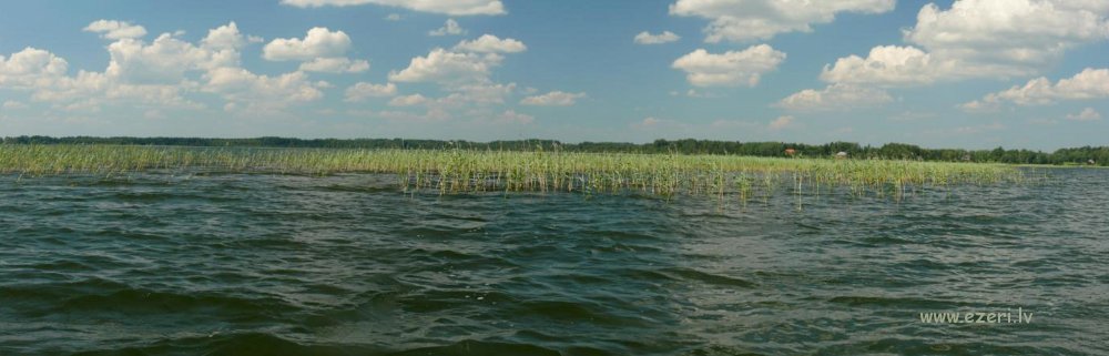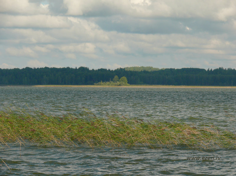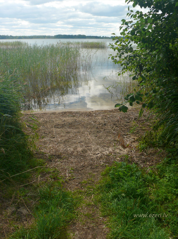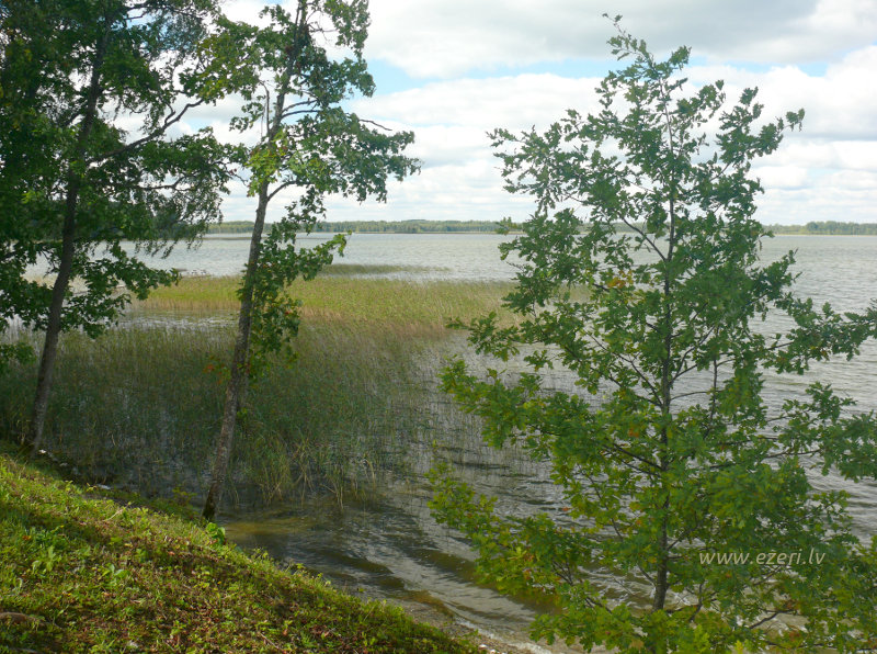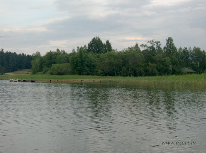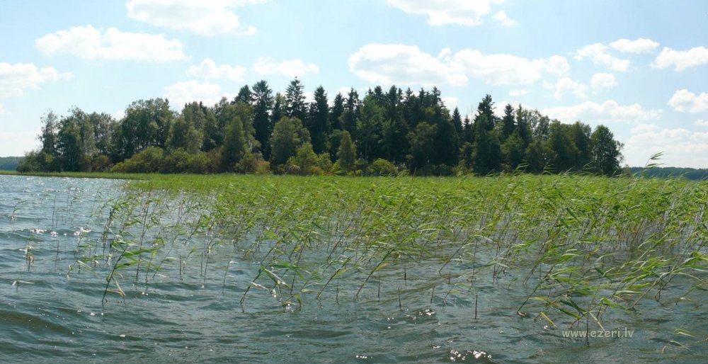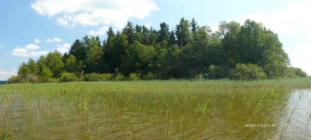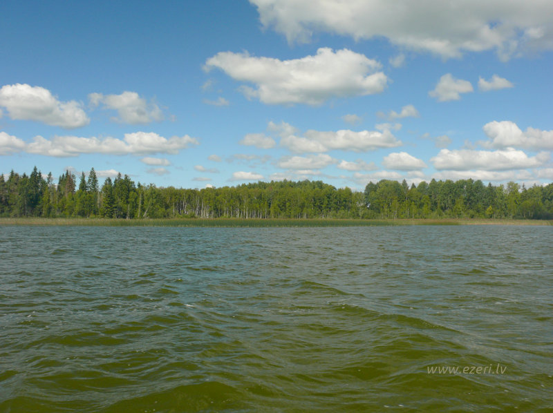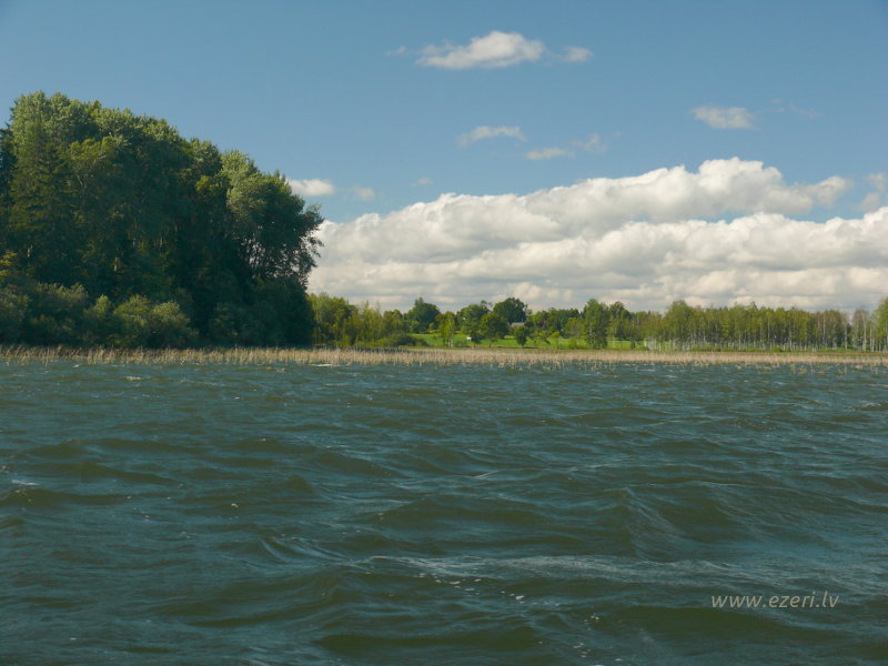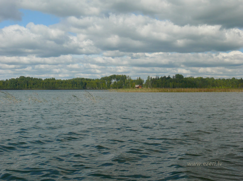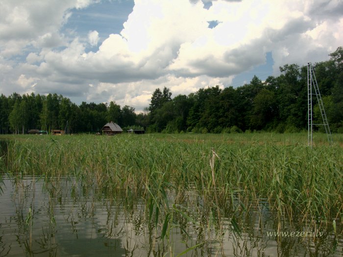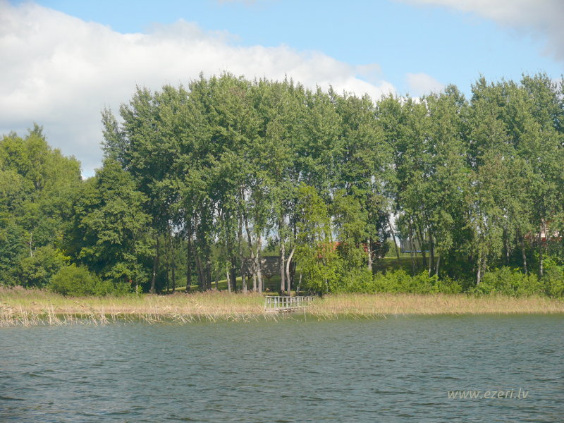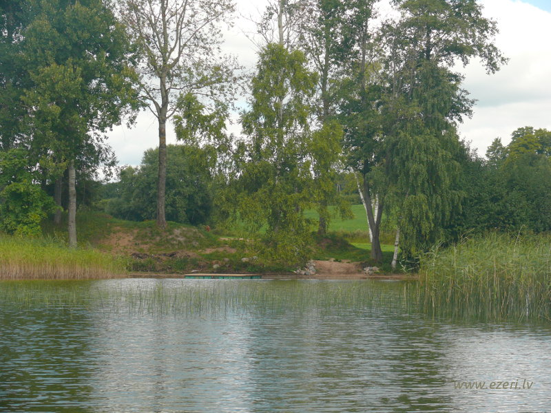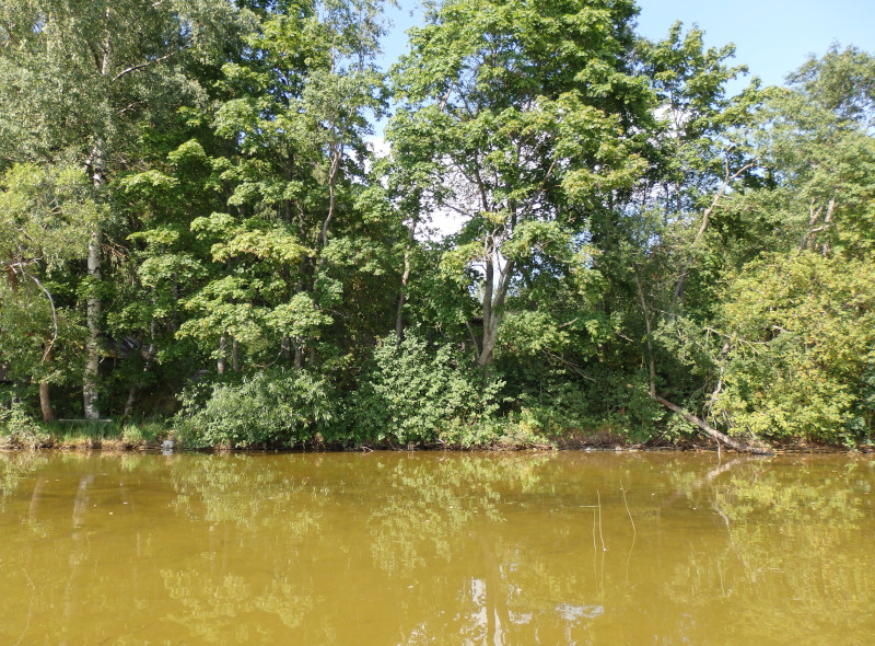 photograph Gar ūdeni zems, krūmiem un niedrēm aizaudzis krasts, pēc 20 m - krasta valnis. |