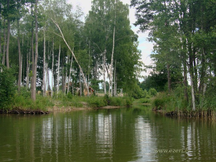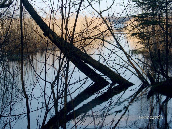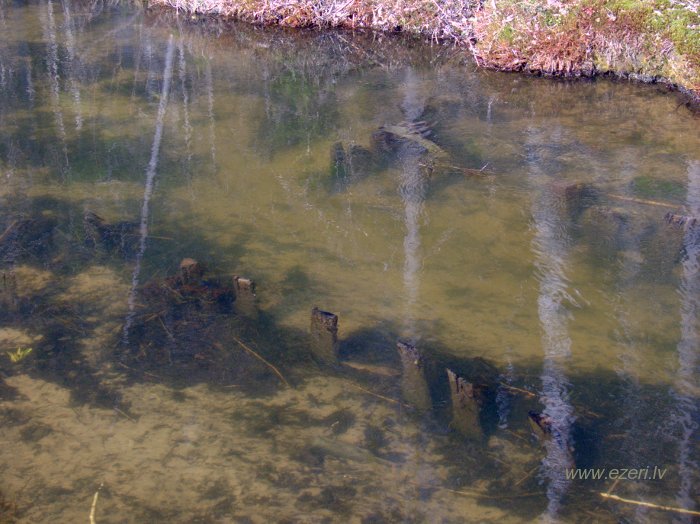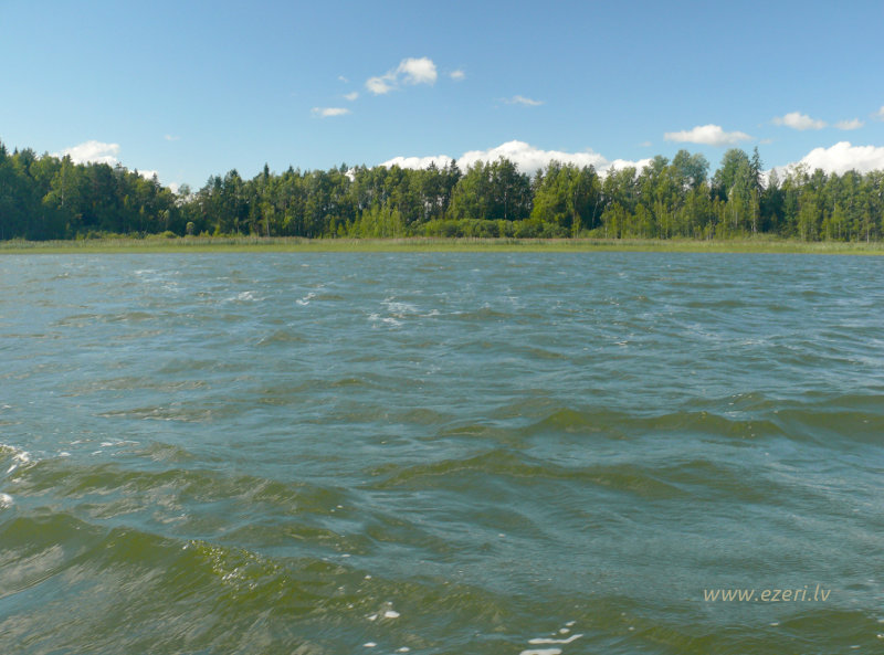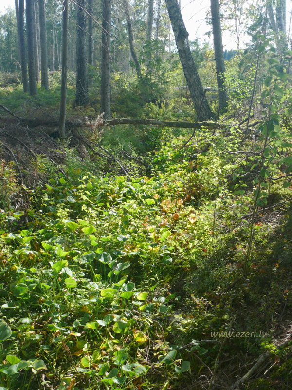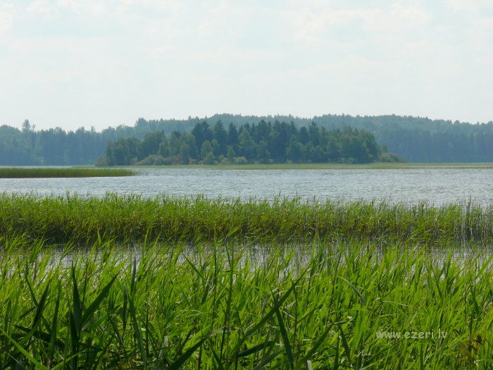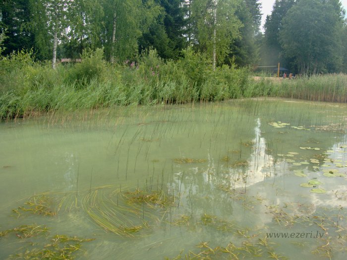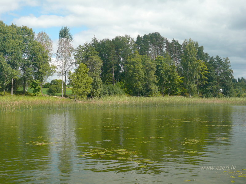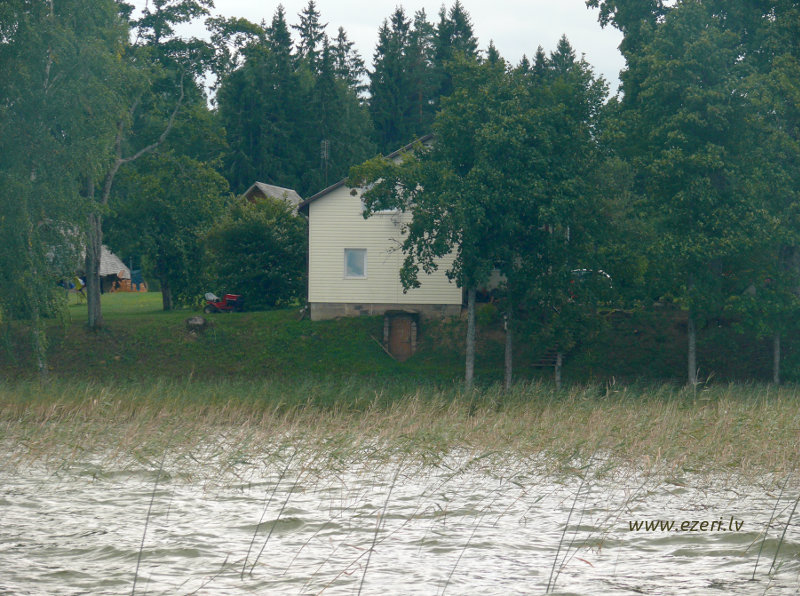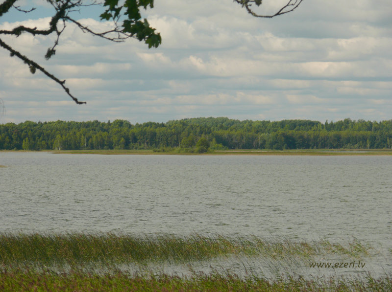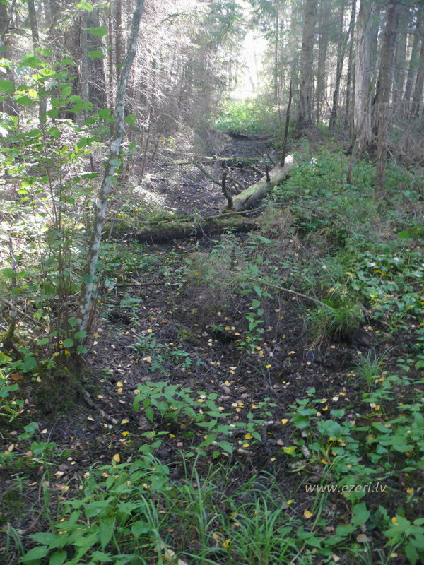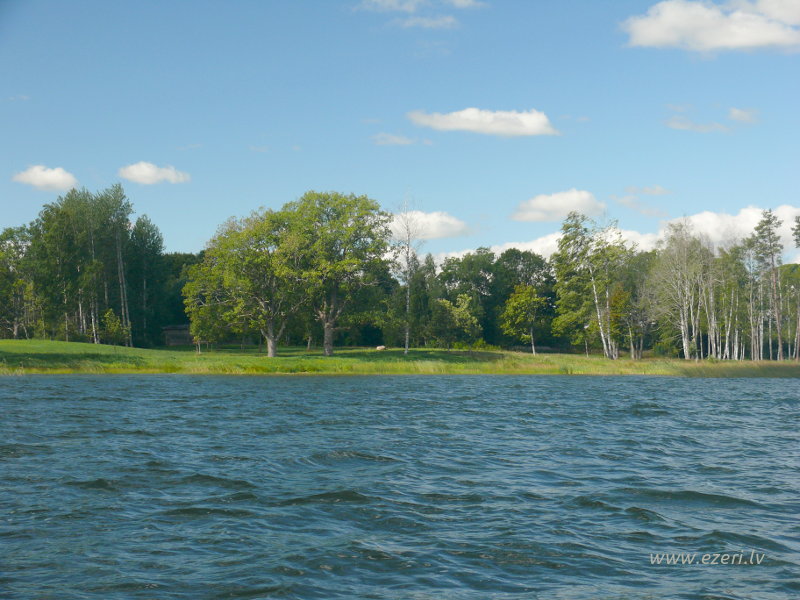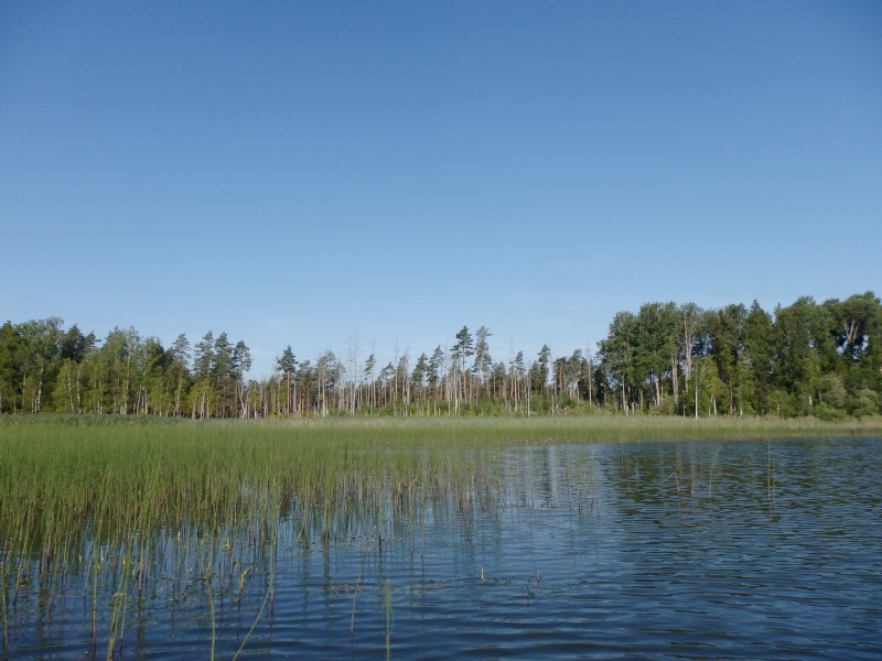 photograph Gar ūdeni zems, krūmiem un niedrēm aizaudzis krasts, pēc 20 m - krasta valnis. |