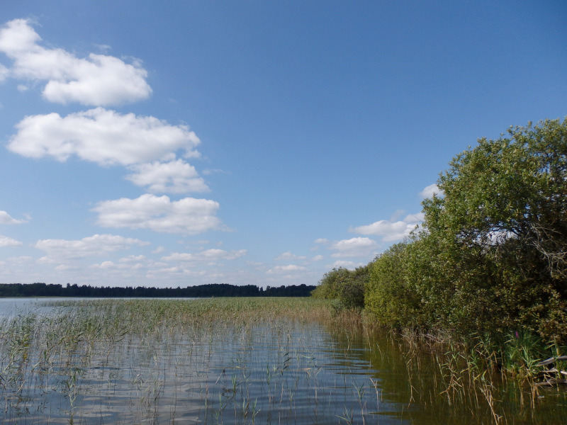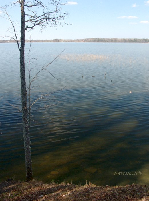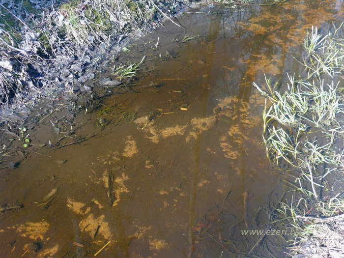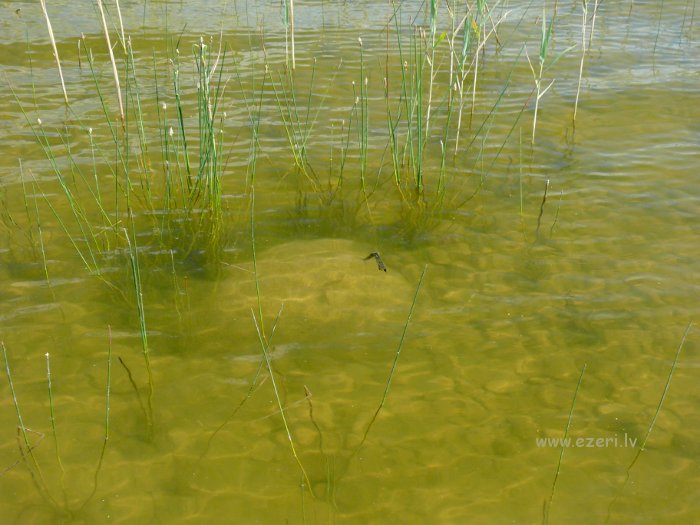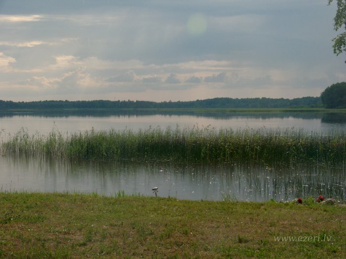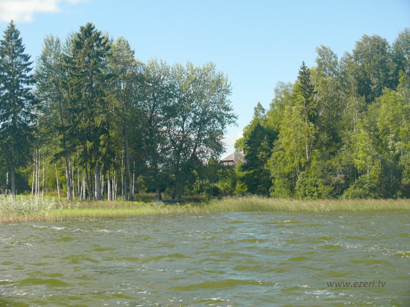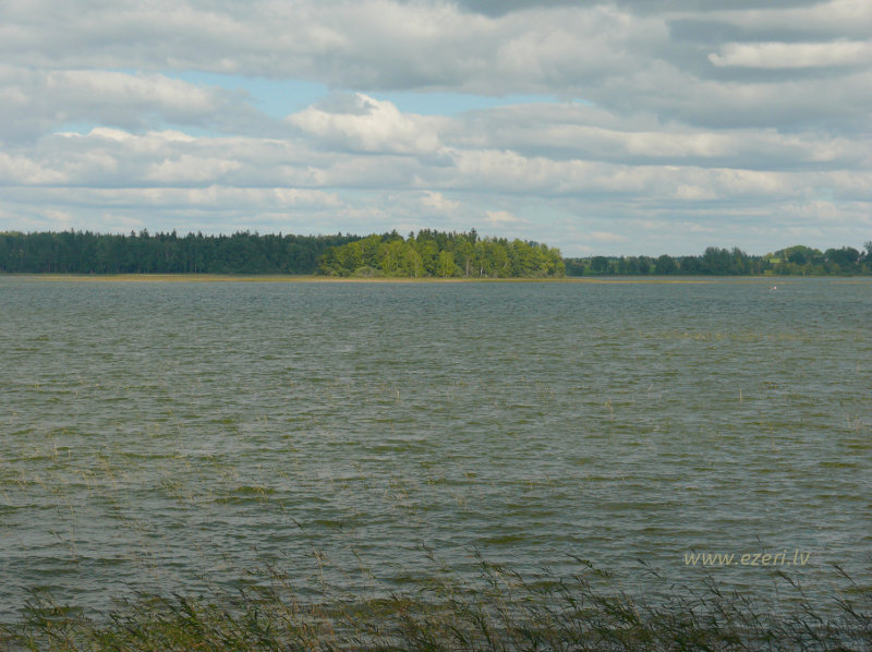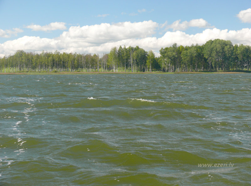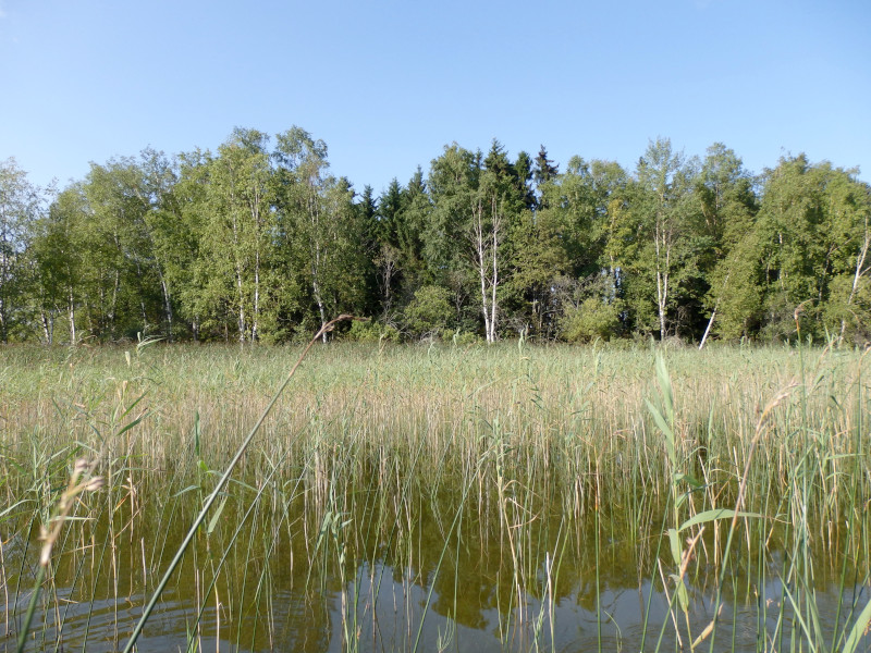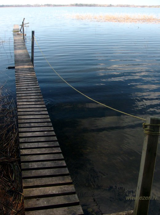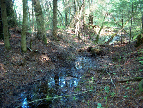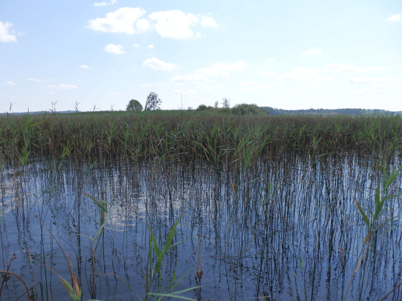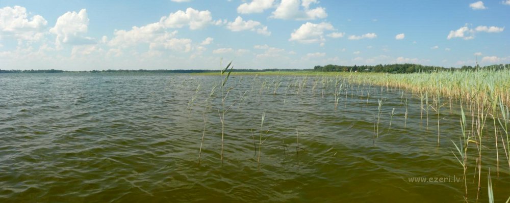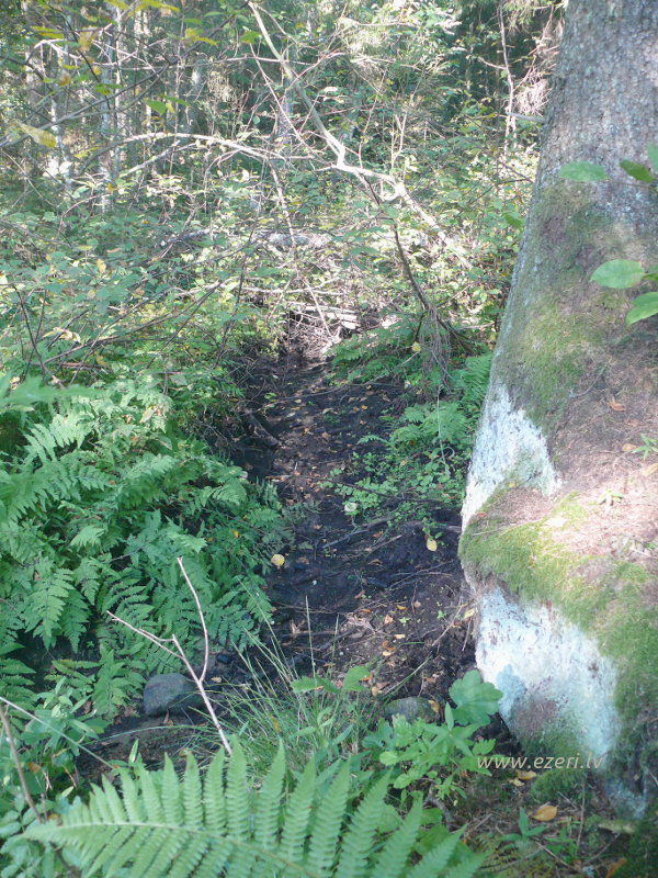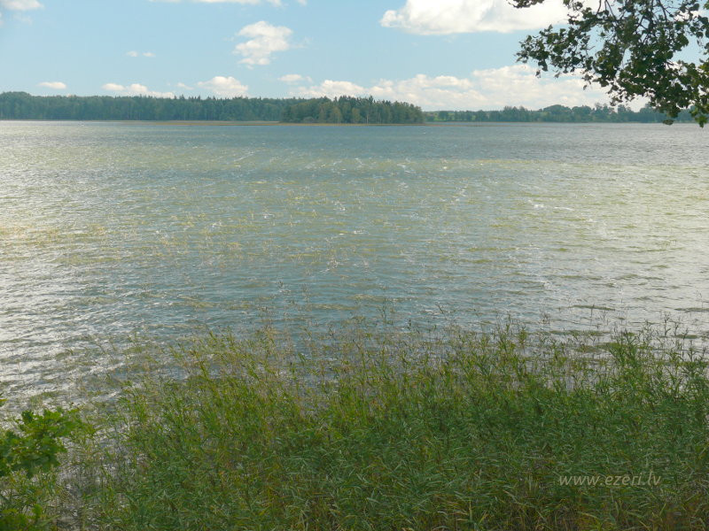 photograph Gar ūdeni zems, krūmiem un niedrēm aizaudzis krasts, pēc 20 m - krasta valnis. |