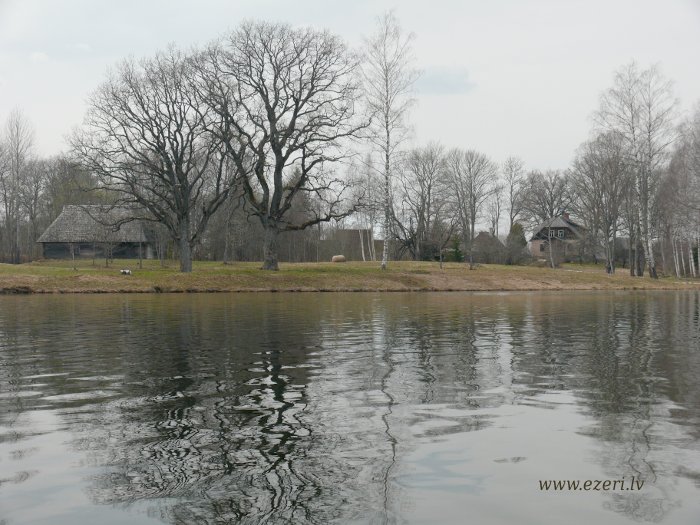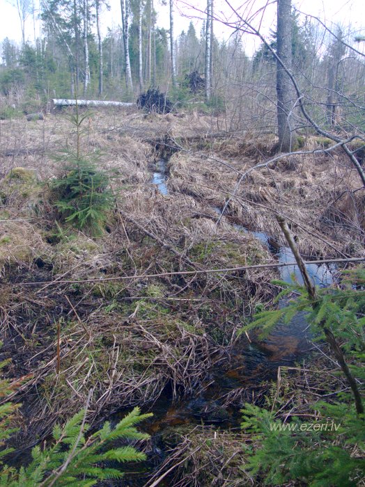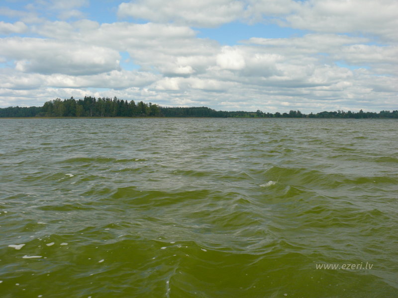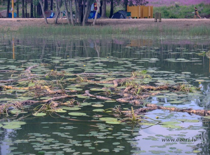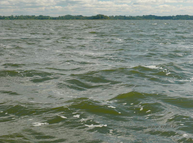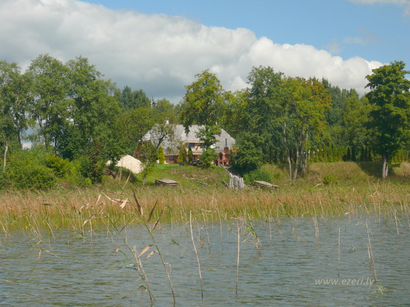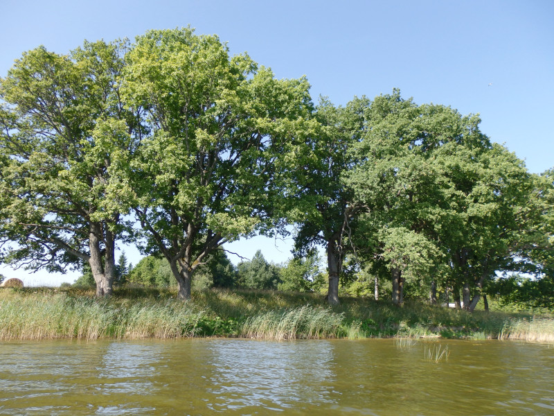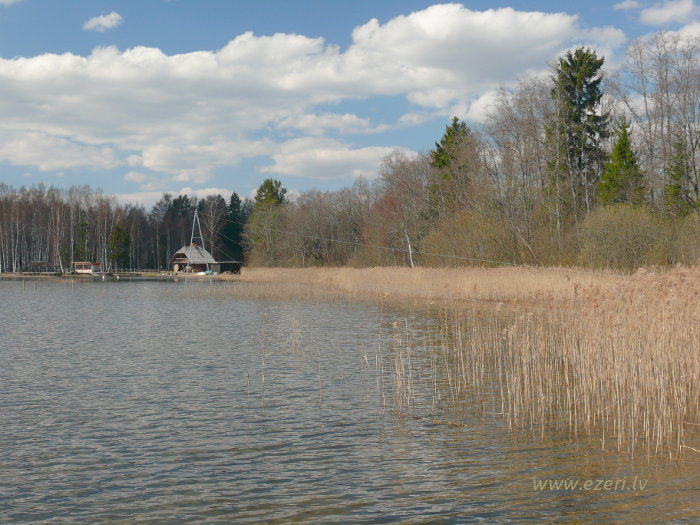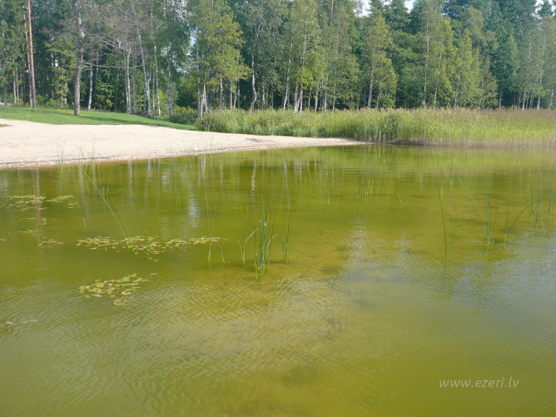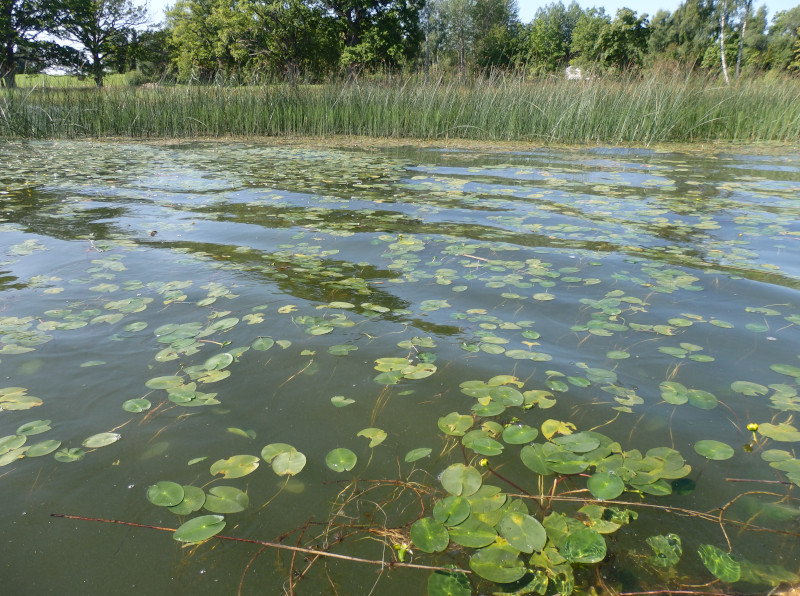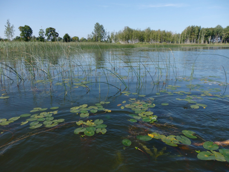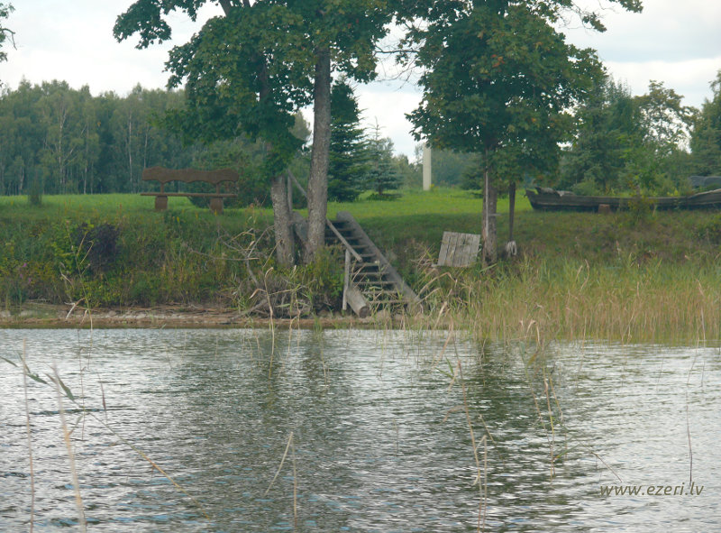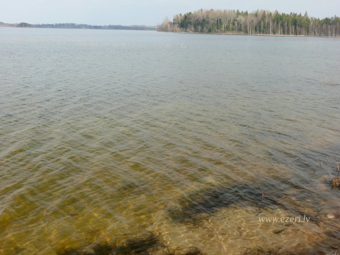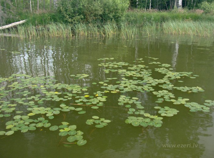 photograph Gar ūdeni zems, krūmiem un niedrēm aizaudzis krasts, pēc 20 m - krasta valnis. |